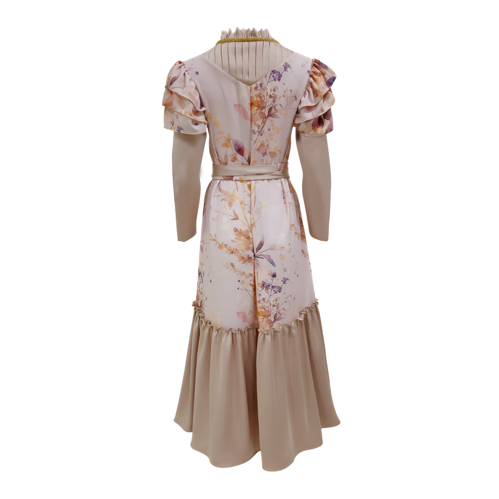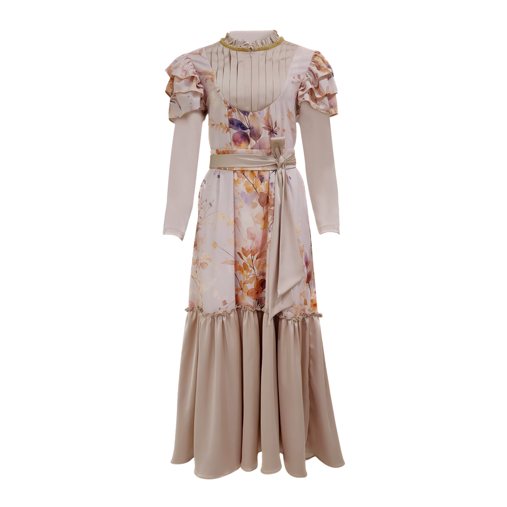 Memiliki gaya yang elegan dan dihiasi dengan payet. Terbuat dari bahan satin dan elena print yang nyaman untuk dipakai sepanjang hari. Panjang gaun ini memberikan kesan anggun dan menawan. Dilengkapi dengan lengan manset, memberikan kesan modis. Didesain agar bisa dipakai di berbagai musim, terutama saat lebaran.