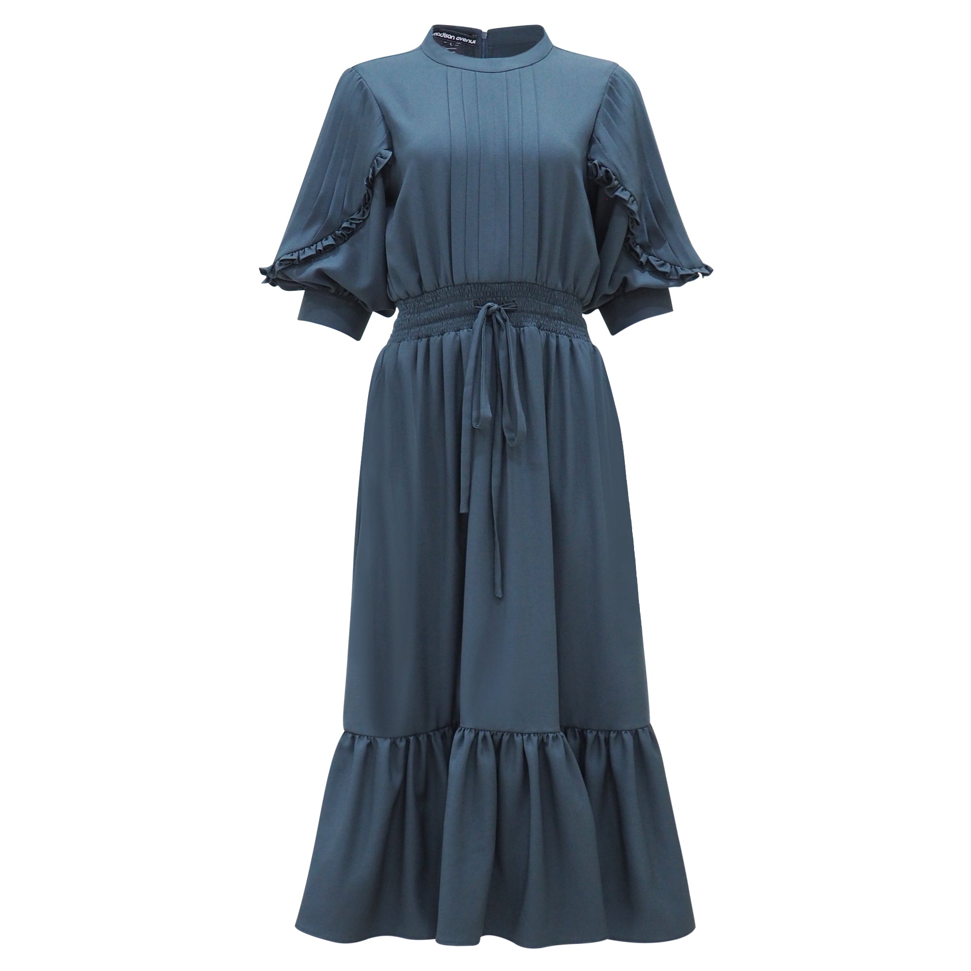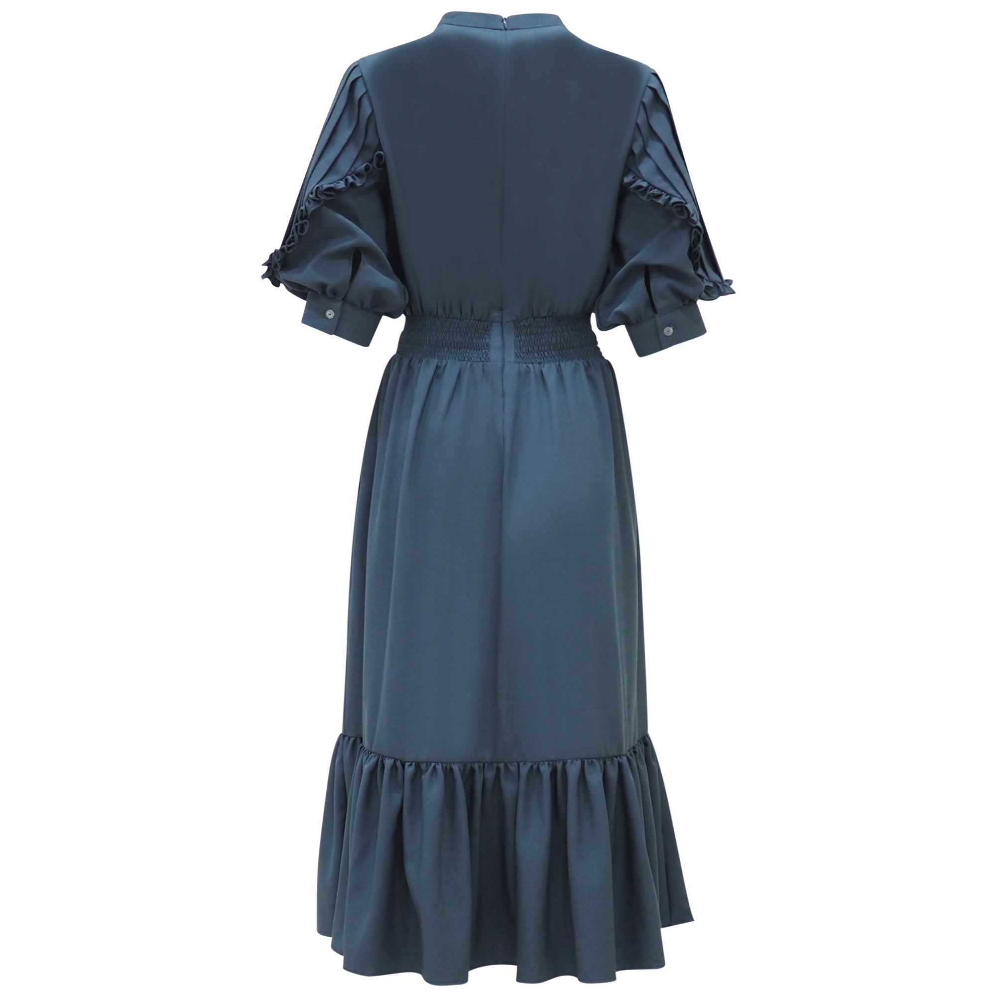 Gaun wanita dengan bahan premium crepe, kerah bulat dan juga di bagian pinggang tedapat karet serta resleting belakang yang sangat nyaman saat di gunakan.